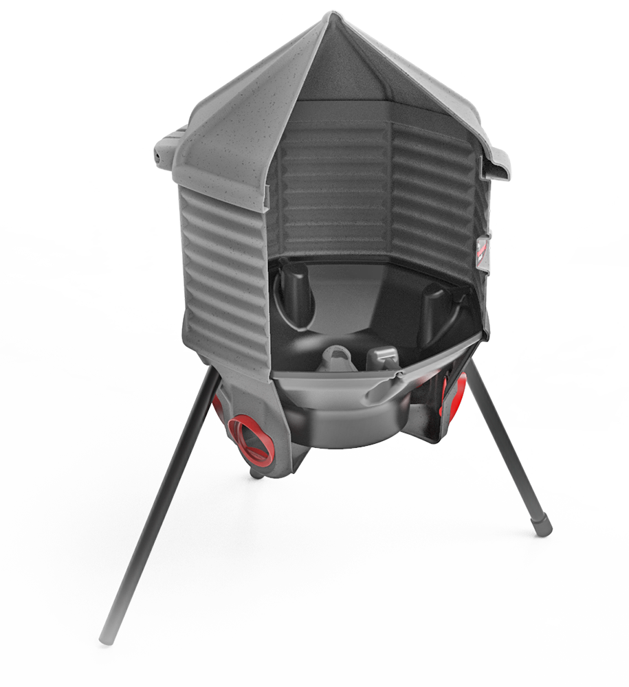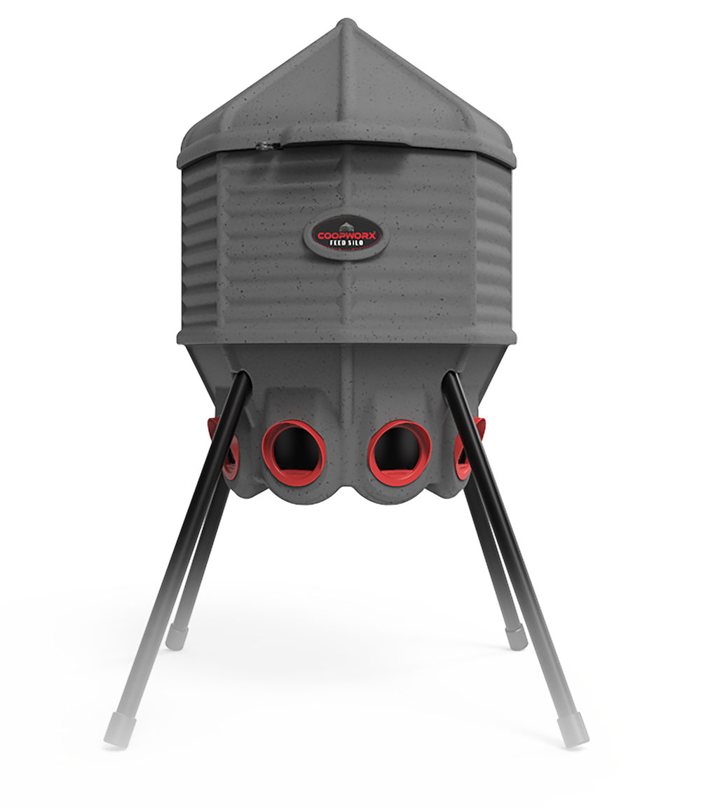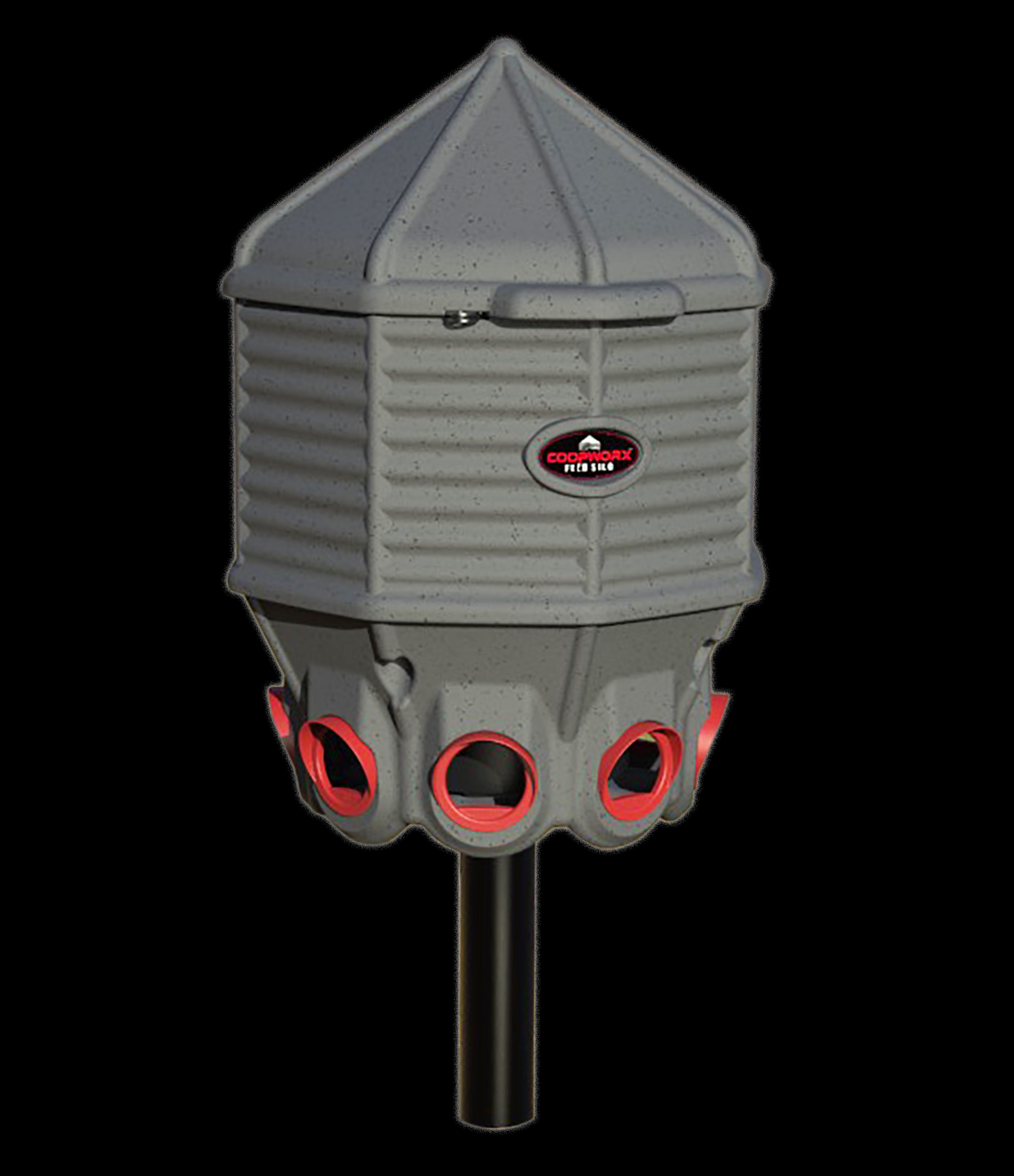 CoopWorx, features a roost-resistant hinged lid that provides easy access to load feed, and integrated drip edges to channel water away from the ports.